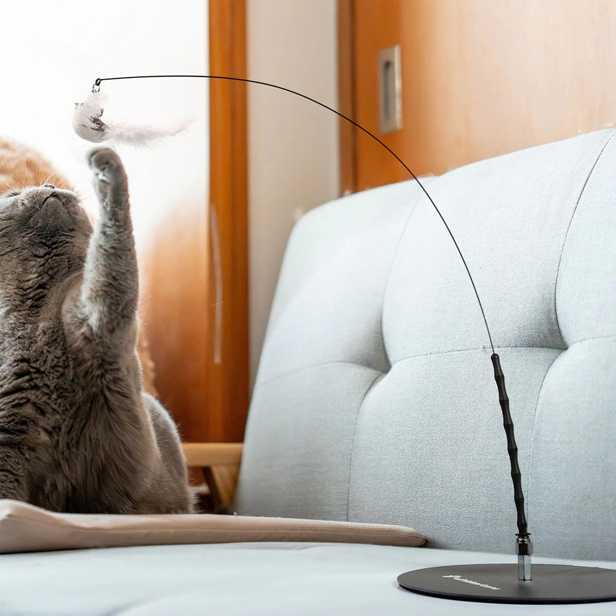 - Self-holding base and a wire that moves around while your cat plays with the bird.